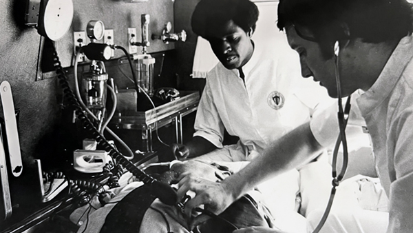 Freedom House Ambulance EMT James Kyte & Dr. Bill Raynovich doing a physical assessment on Phil Hallen. 1968-1969 (source: John Moon)
